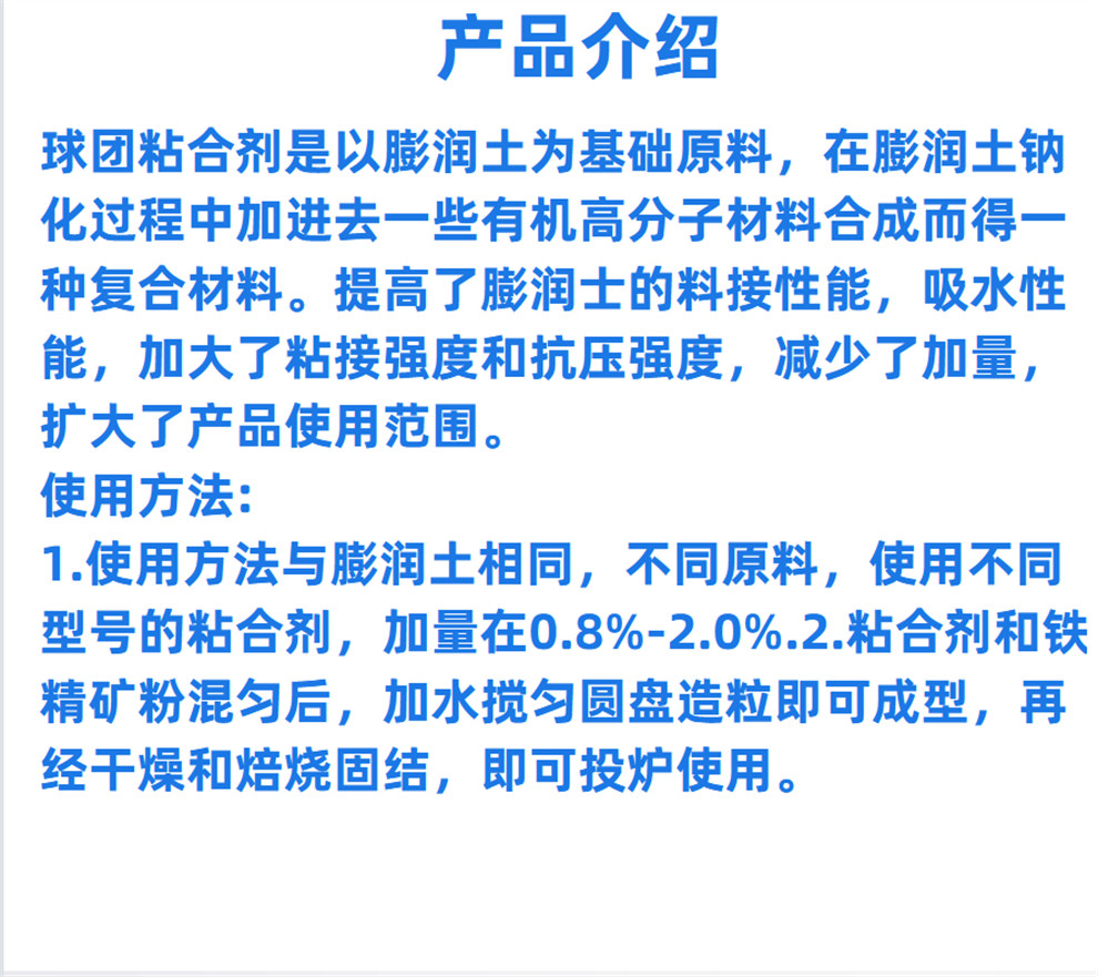 產(chǎn)品介紹:球團(tuán)粘合劑是以膨潤土為基礎(chǔ)原料,在膨潤土鈉化過程中加進(jìn)去一些有機(jī)高分子材料合成而得一種復(fù)合材料。提高了膨潤土的粘接性能、吸水性能,加大了粘接強(qiáng)度和抗壓強(qiáng)度,減少了加量,擴(kuò)大了產(chǎn)品使用范圍。應(yīng)用范圍:應(yīng)用于各種鐵精粉球團(tuán)礦造球。包裝及貯存:25k……