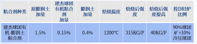方法:鐵精礦粉中加入建杰球團(tuán)有機(jī)粘合劑與部分膨潤(rùn)土混勻后,利用圓盤造粒成型技術(shù),制備成強(qiáng)度合適的球團(tuán),經(jīng)焙燒成鐵礦球團(tuán)再投爐使用。