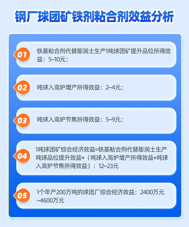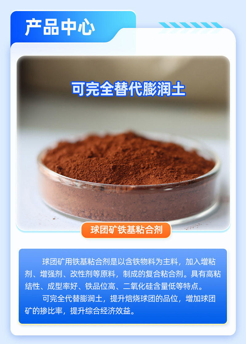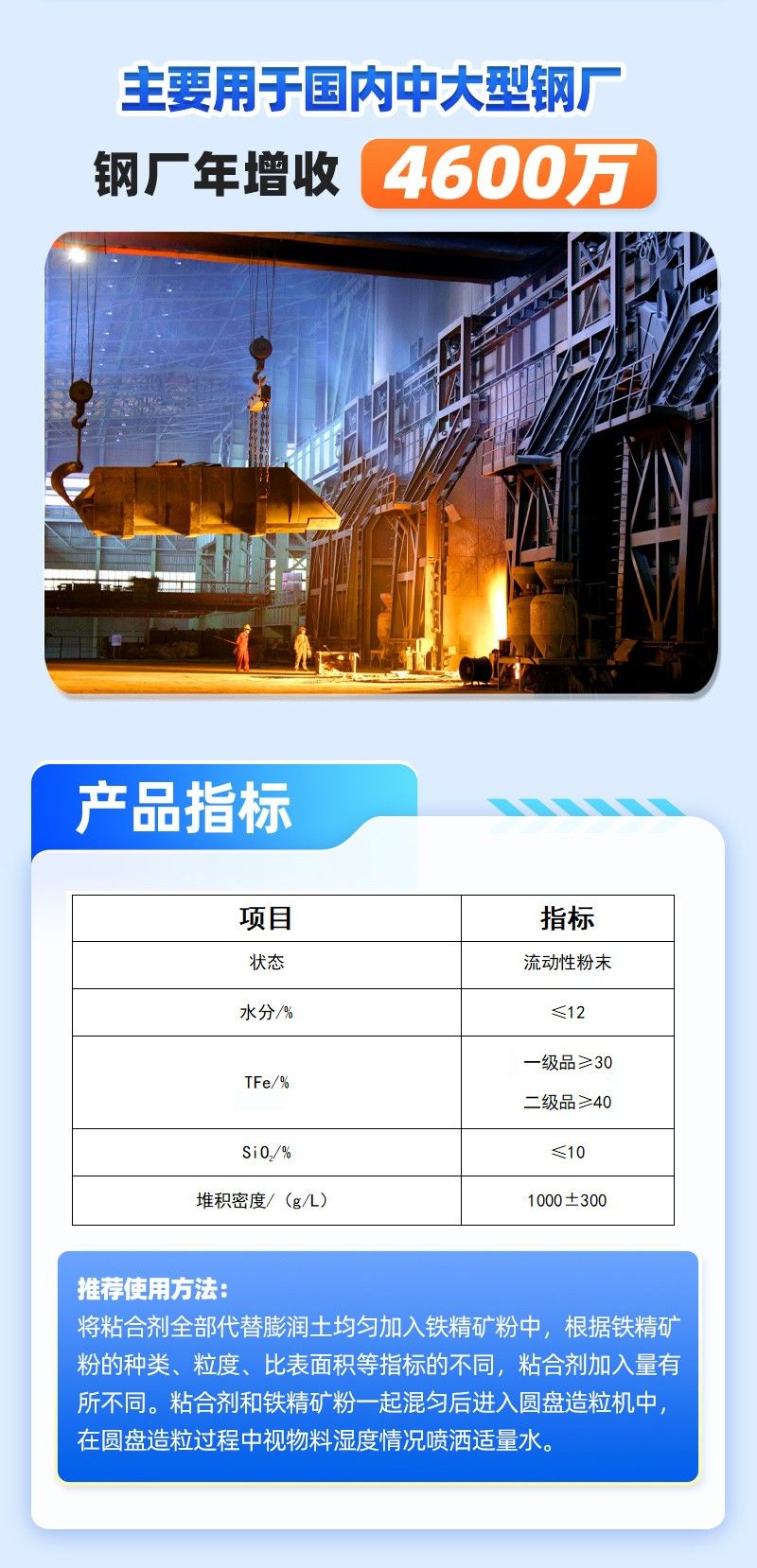 產(chǎn)品介紹:含有高粘結(jié)力成分、中低溫固結(jié)成分,具有粘結(jié)力強(qiáng)、成型率好、鐵品位高、 二氧化硅含量低等特點(diǎn),可完全代替膨潤土,提升焙燒球團(tuán)的品位,增加球團(tuán)礦的摻比率。